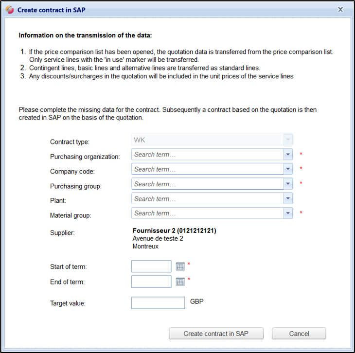 Fill in all mandatory fields and then click Create Contract in SAP. After successful transmission, you will be shown the number of the created Contract directly.