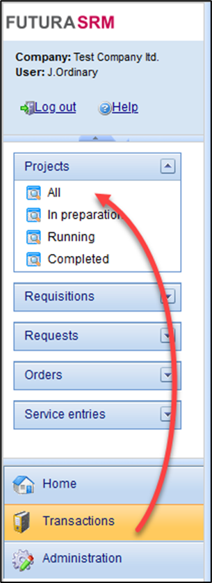 The area "projects" can be found via the transactions menu "projects" list (e.g.) "All". Click here on any overview.