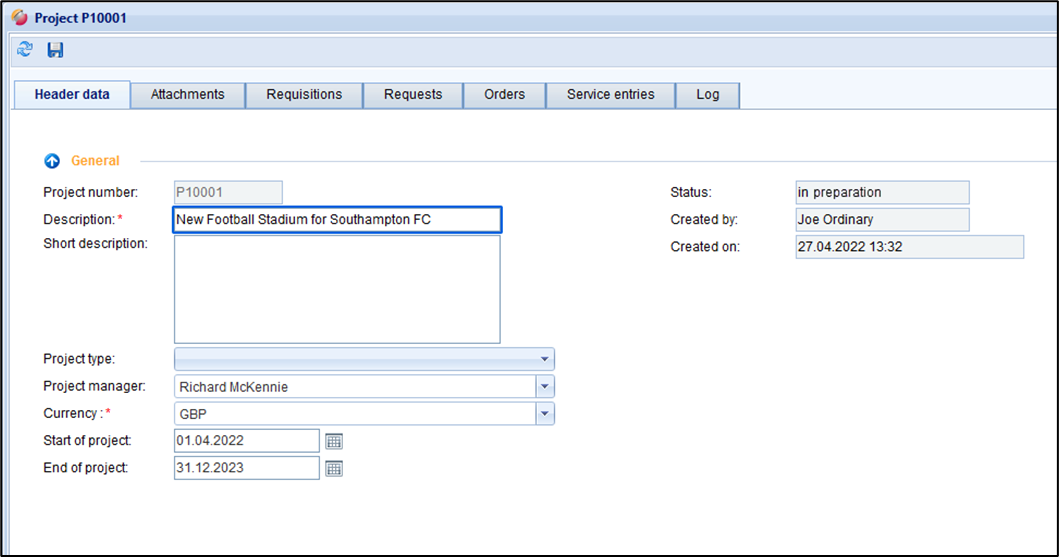 The project form is displayed with the Header Data tab. After the fields marked with 'asterisks' have been filled in, the other tabs appear after the first save (click on the floppy disk button). The project number is either automatically generated and displayed or the field remains editable (depending on the setting for your organizational unit). The status of the project changes to "In Preparation".