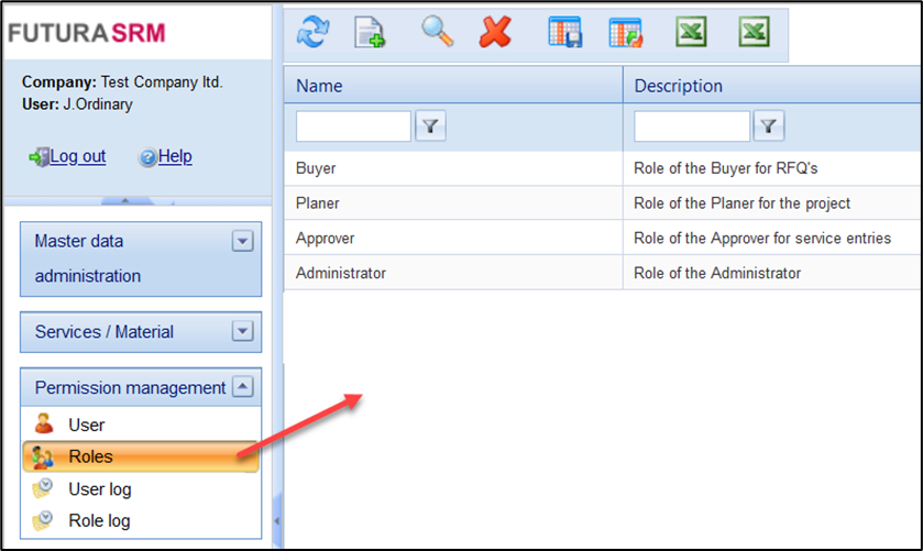 Switch to the Role menu or to the "Role" tab in the company data. Each user must be assigned to at least one role. You use the roles to define which authorizations a user has within the FUTURA Engineering system .
