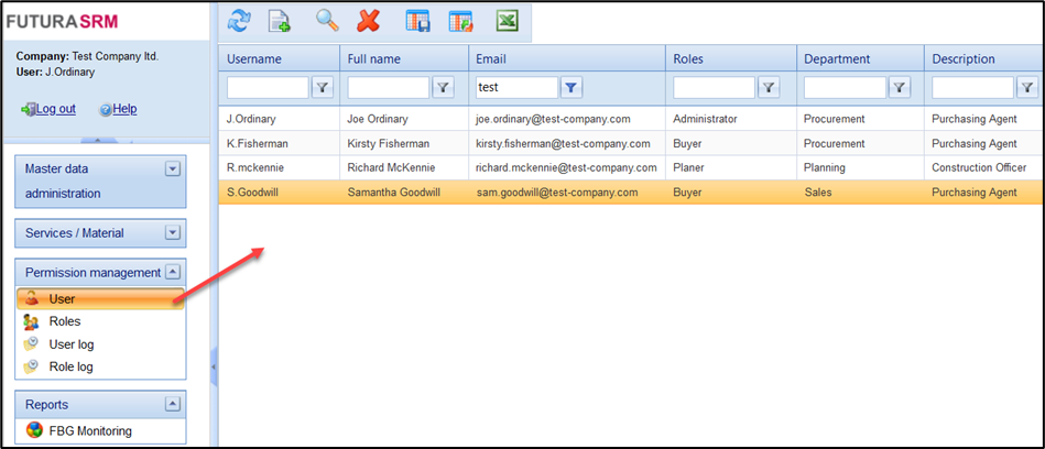 Switch to the Users menu or to the "Users" tab in the company data. Here you can see all users listed in tabular form that have already been created.