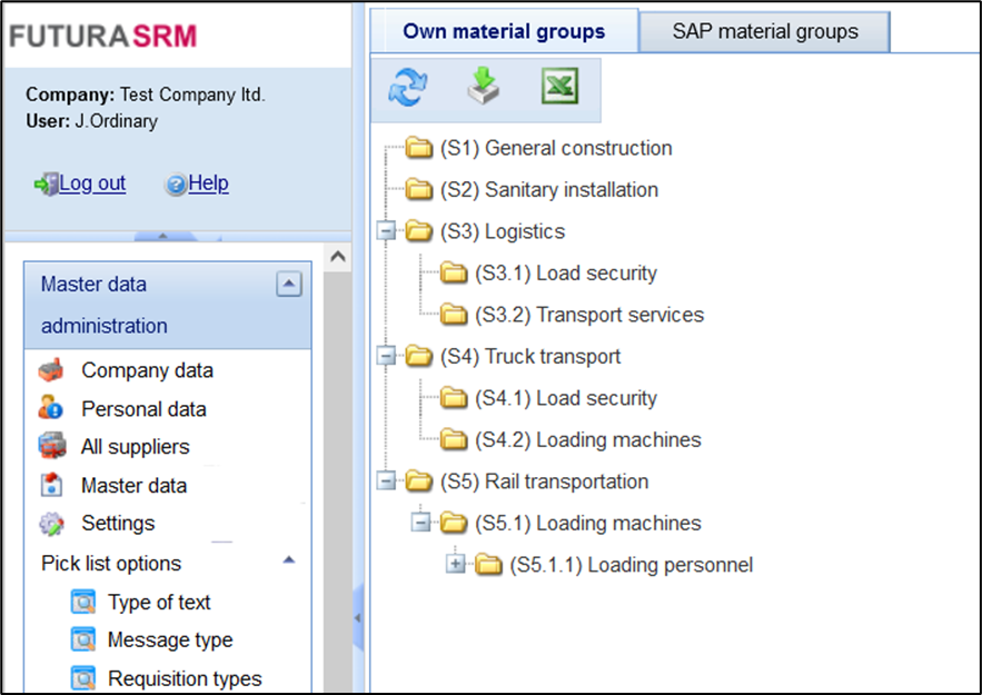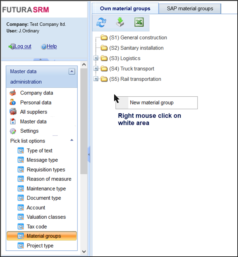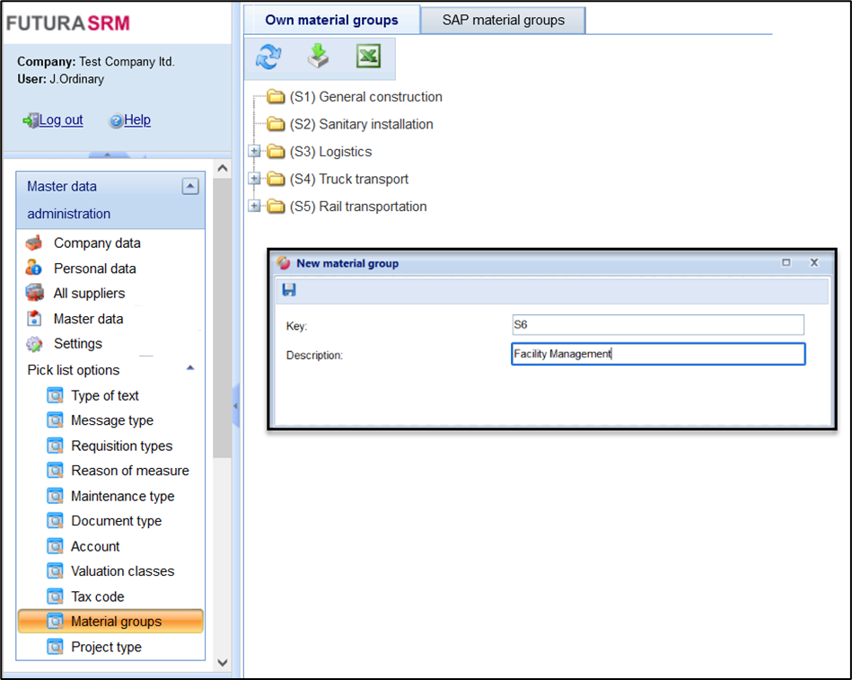 In the "Material groups" area, you can create your own company material groups. These will then also be available to other users within your organizational unit. The material groups can be assigned to the master records of the suppliers as soon as they are created.