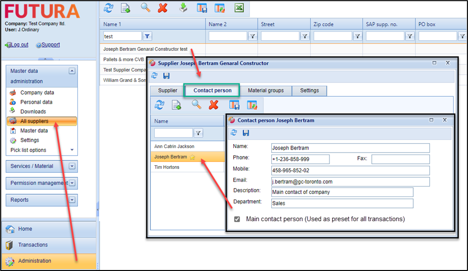 Select the desired supplier company with a double-click and switch to the tab "Contact person". Select the contact person with a double-click and tick the "Main contact person" box at the bottom of the master data. Save your change(s) with the floppy disk.