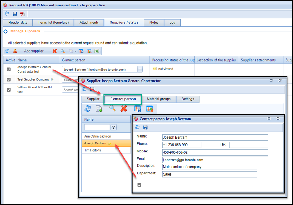 Select or create your desired request and switch to the "suppliers/Status" tab. If you haven't added any suppliers yet, then proceed with this step first. After adding suppliers, double-click to open the master data of your desired supplier and switch to the tab "Contact person". Now select the desired contact person and check the box "Main contact person" at the bottom of the master data. Save your change(s) with the floppy disk.
