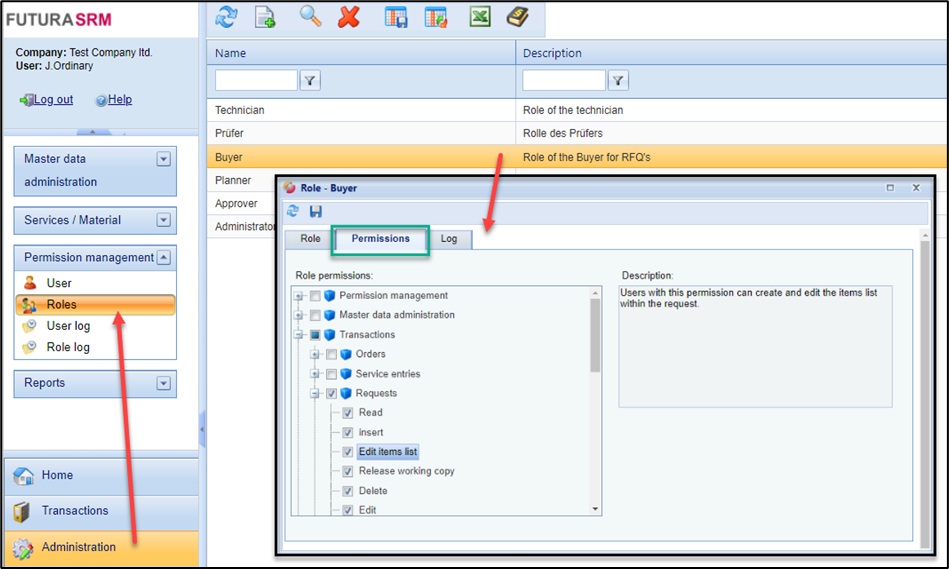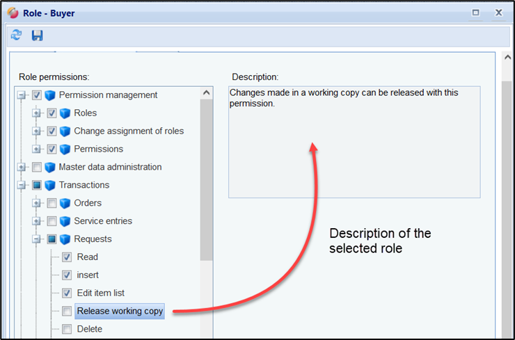 To set the permissions for a role, open the role by double-clicking or the "Details" button and switch to the "Permissions" tab.