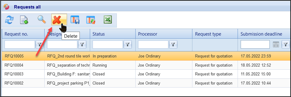 To delete/cancel a request, please select it in the request list and click on the delete button:
