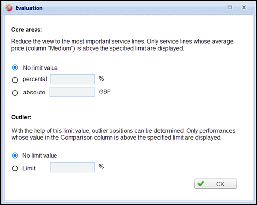 If an absolute limit of EUR 500 is entered, all services whose average price (column "Medium") is less than the entered limit value are hidden. In the example (see fig.), the view is thus reduced to the service line 0040: