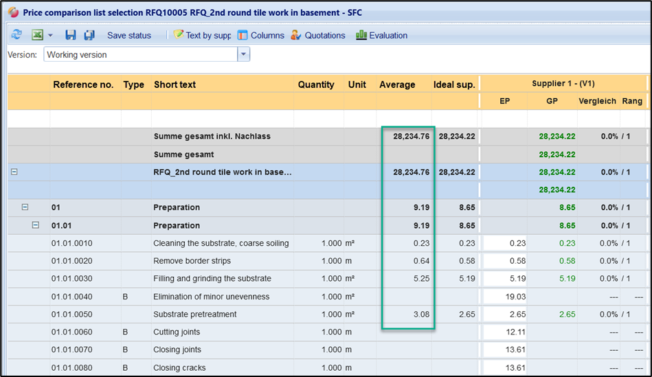 With the help of this limit value, so-called “outliers” can be filtered out, in which the quotation price of a bidder deviates significantly from the average or minimum price. If you enter a limit in %, only services whose value in the Comparison column is above the specified limit are displayed. This reduces the advertisement to services in which a bidder deviates significantly from the other bidders in his quotation.