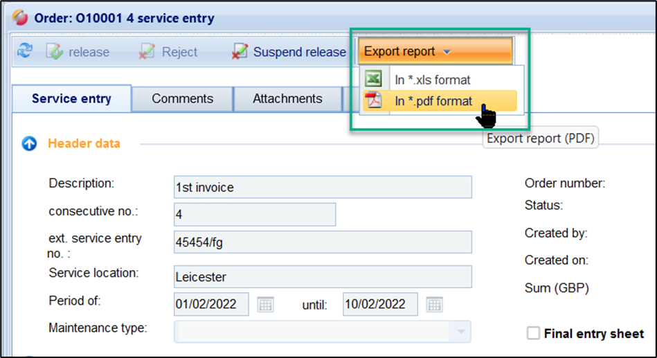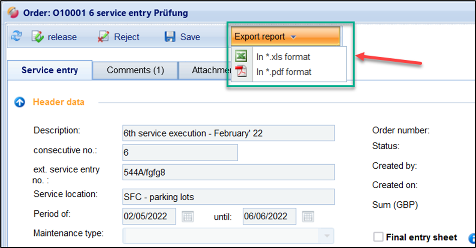 Export of a service entry report