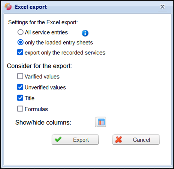 Options for the excel report of a service entry