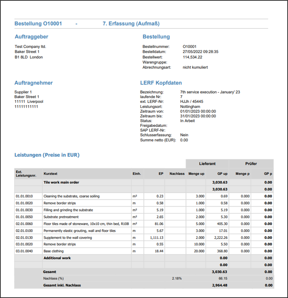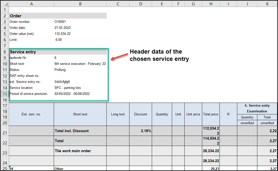 If you only export the loaded line entry, you will also see the header data of the service entry: