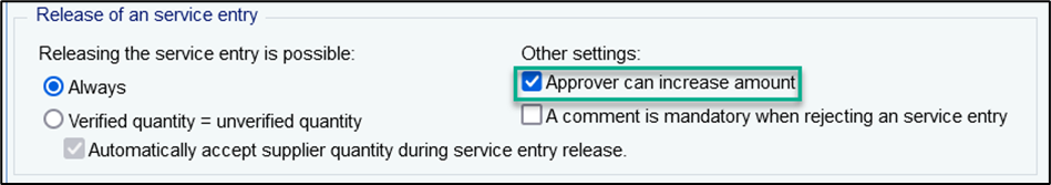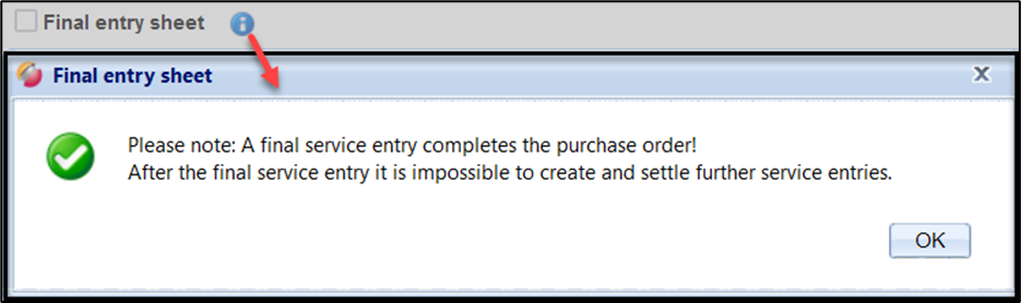 The 1st partial entry includes all service lines with the quantities checked by you, i.e., the services that are undisputed. This entry is transmitted to SAP and released. The SE indicator is removed upon release and no end entry indicator is transferred to SAP.