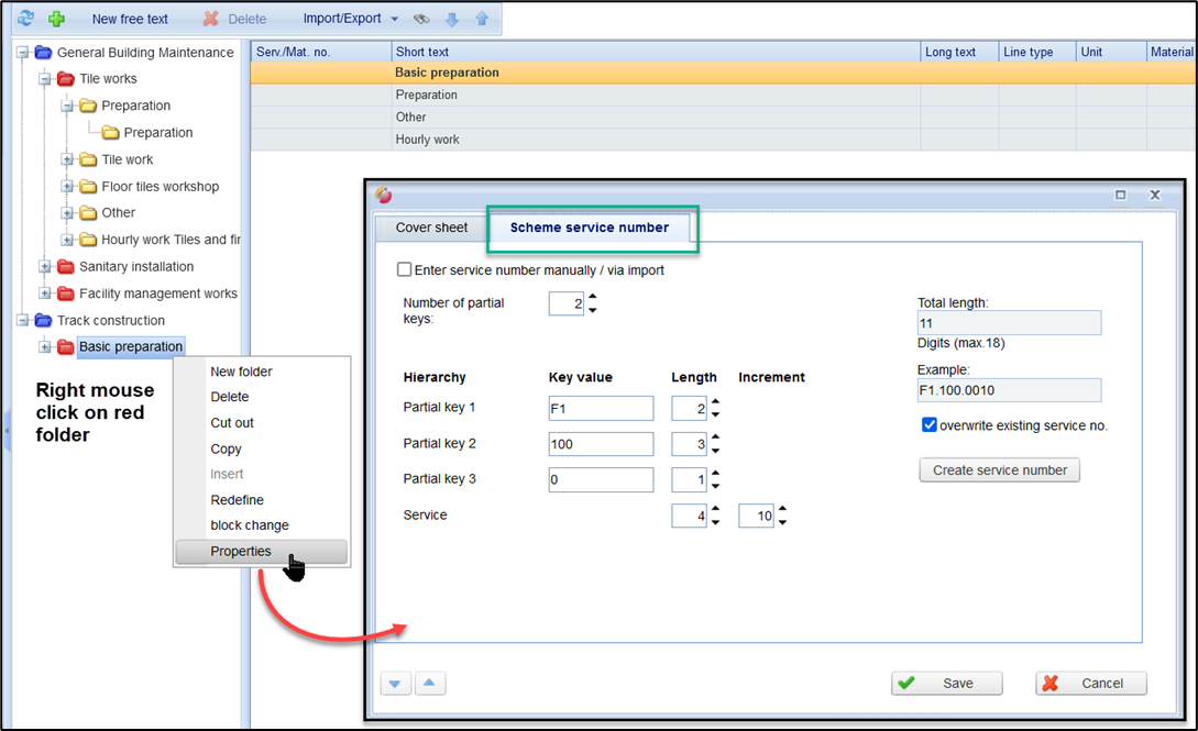 The partial keys are the same for all service lines of the item list, which are numbered according to the specified scheme. Only the last section (service) is variable and is counted up according to the step size. According to the example in the figure, the following numbers result: