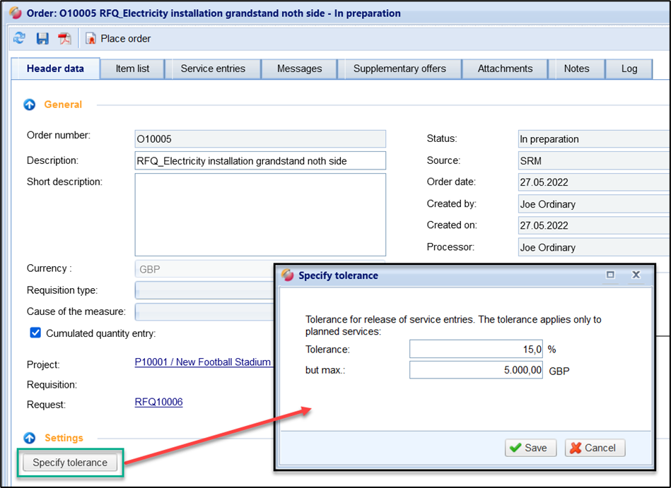 You can use the button “Specify tolerance” to set up a general tolerance for the order, which has an effect on the release of the service purchases. Regardless of the system in which (SAP, FUTURA Engineering, etc.) the order has been created. The tolerance can prreference no. in relation to the order value or as a maximum amount. The tolerance only affects planned service lines.