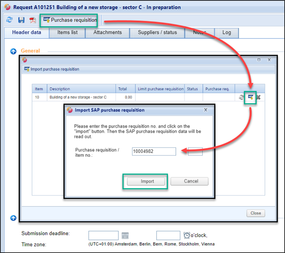 As long as the request is in the status "In preparation", you can import another Purch. Req. at any time using the same procedure or re-import and assign an already assigned Purch. Req. (e.g., after a Purch. Req. modification SAP). With the red "X" button, you can delete the assigned Purch. Req. reference in the status "In preparation“.