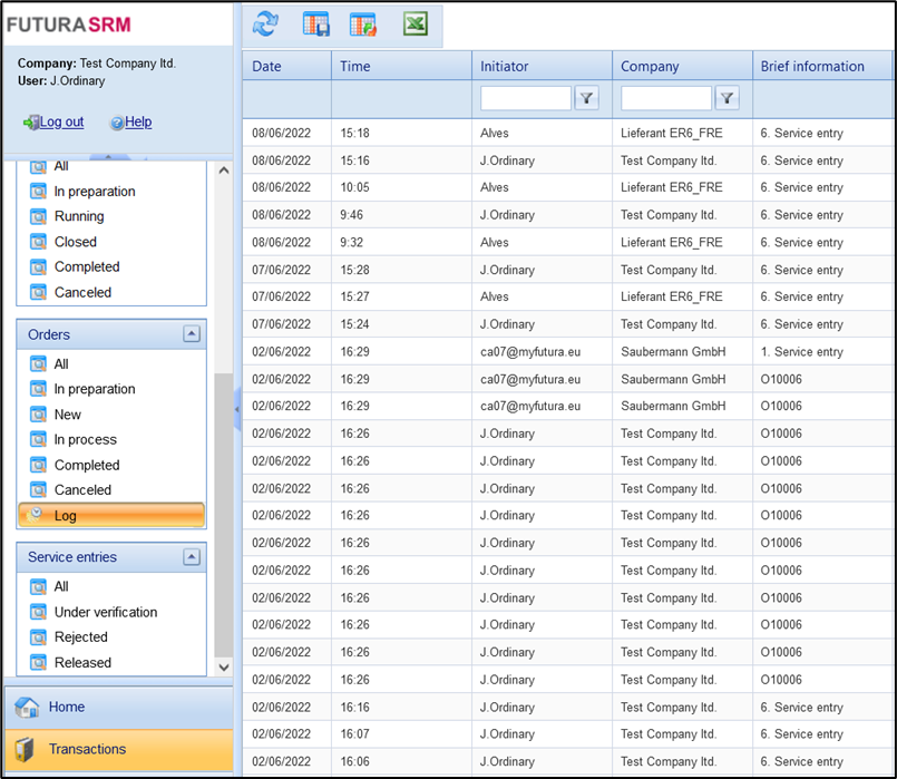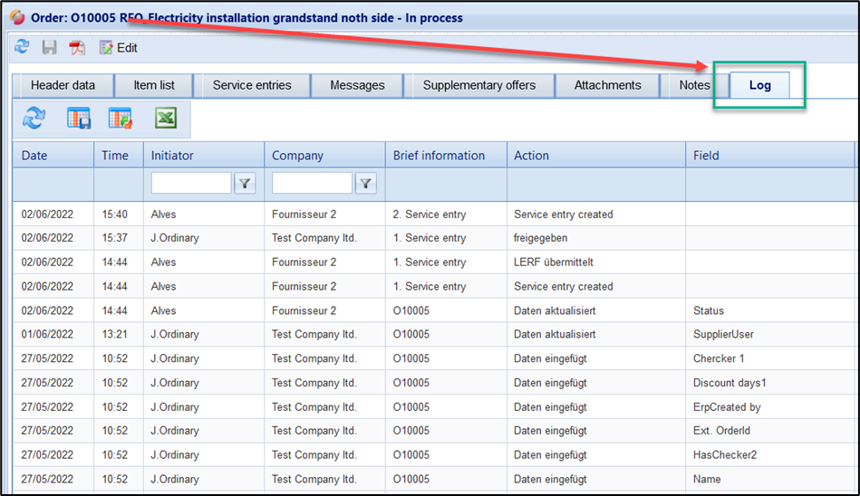 In the Processes / orders / Log area, all actions for orders and service entries are logged. The following actions can be found in the log:
