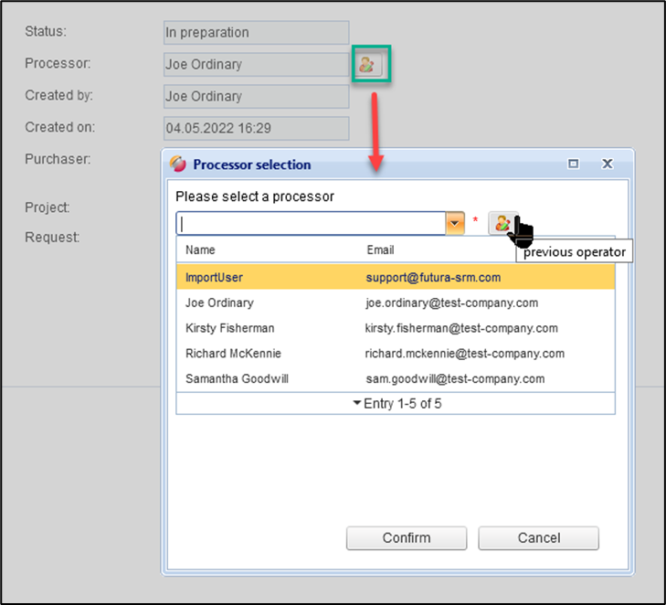Alternatively, with the button "previous processor", within the window "Processor selection", a user (e.g., an internal or external planner) can assign the requisition back to the previous processor after completion of his task area.