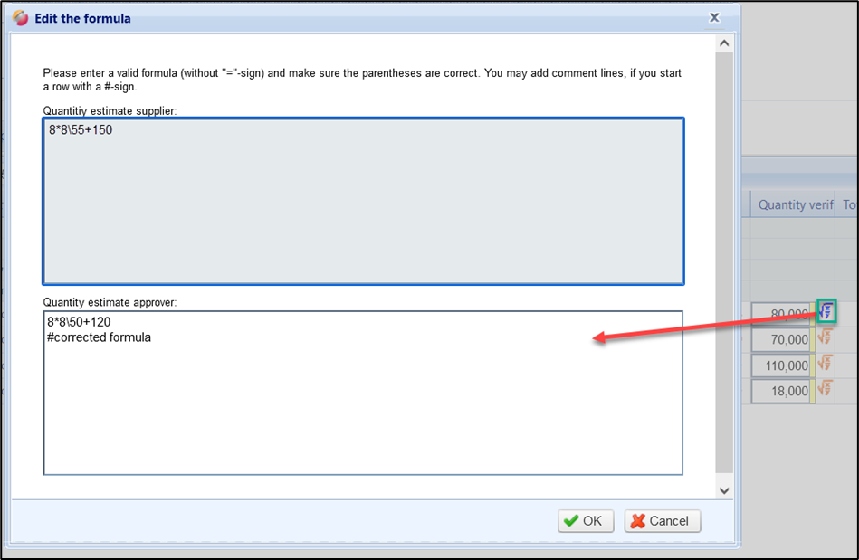 After entering the quantity approach, please click on the “OK” button. The formula window closes, and you see the calculated value of the formula in the quantity field.