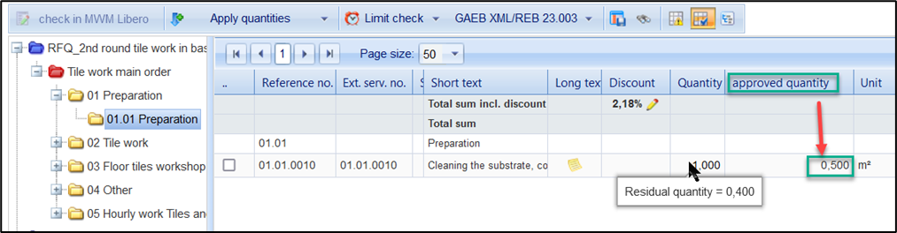 Total remainder | The quantity still to be provided, which can be provided in the remaining entries up to the targeted quantity | Price that can still be billed in the remaining entries up to the targeted Total price | Still to be provided in per cent |
