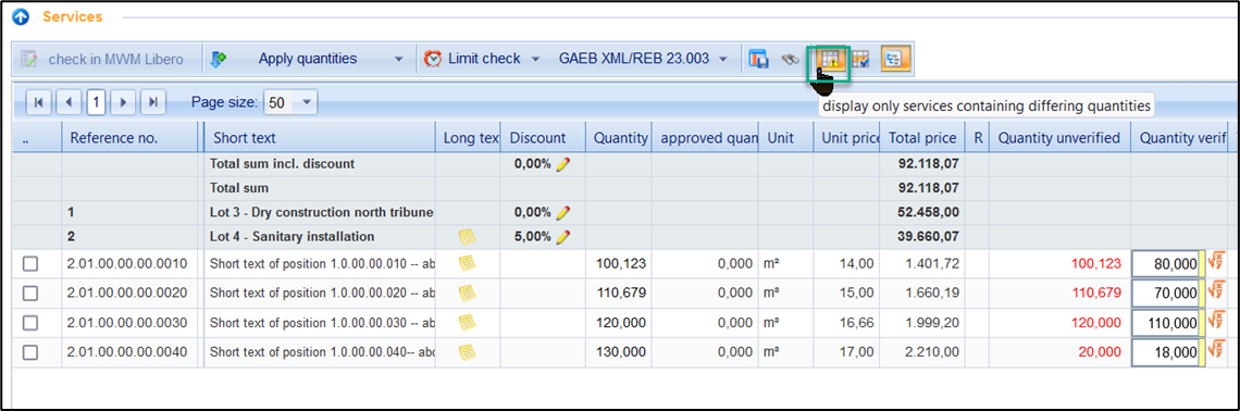 With the help of the button , you can reduce the service entry to services for which the approver quantity (quantity checked) differs from the supplier quantity (quantity unchecked). If you click on the button, only the deviating services will be displayed.