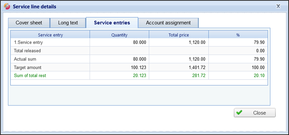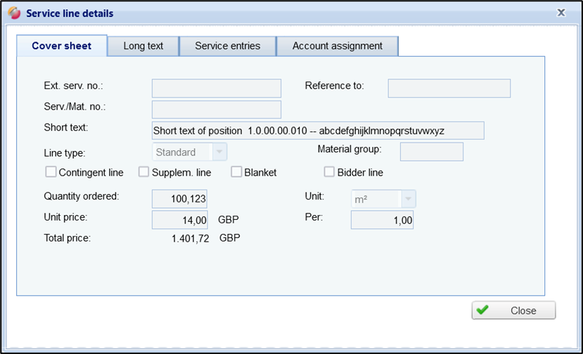 By double-clicking on a service line, you can display the corresponding details. The details are divided into the three tabs “Cover Page”, “Long Text” and “Entries”.