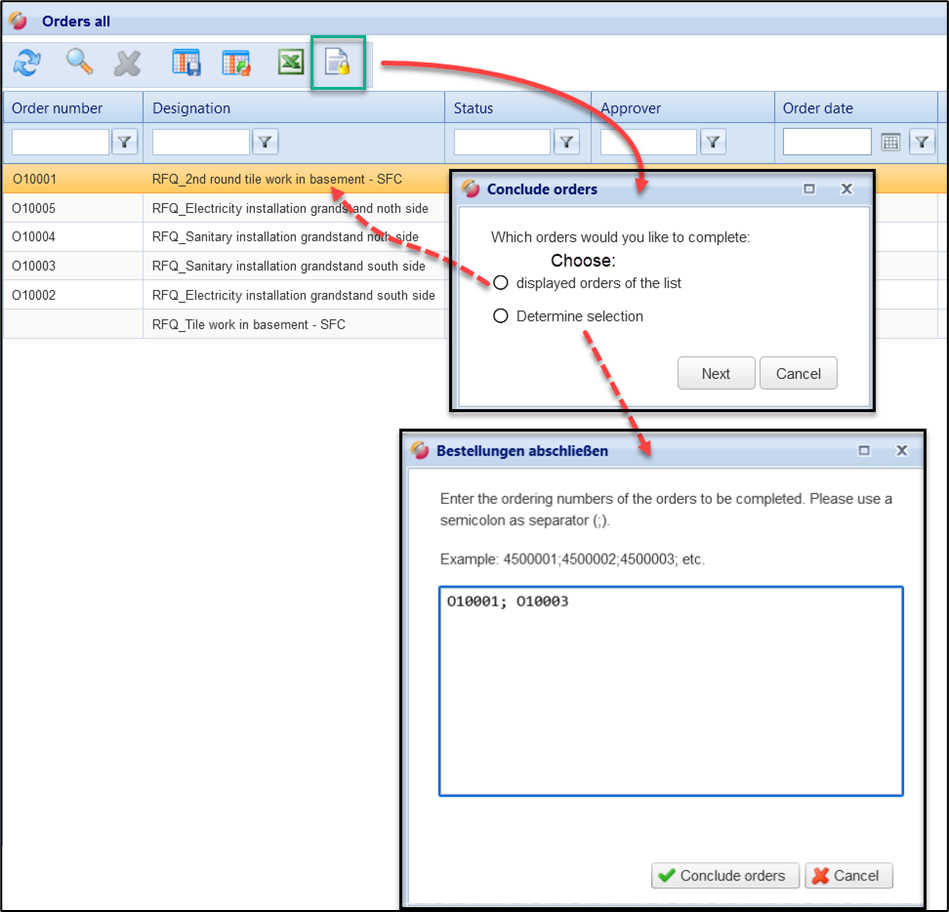 By clicking on the button, all orders displayed in the list are transferred to the status completed. orders that are already in the status "completed" or "cancelled" remain unaffected by the promotion.
