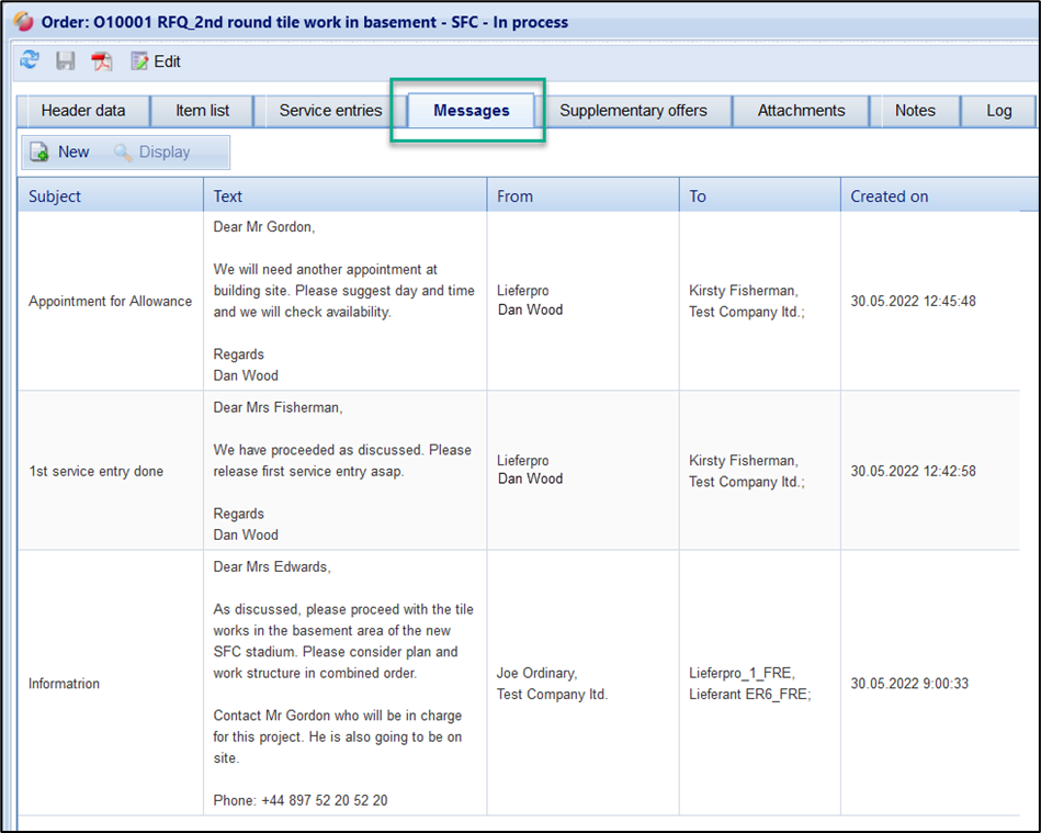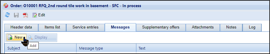 Once the order has been released / published (Status = New), you can send messages to the supplier of the order. To create a new message, click on the "New" button.