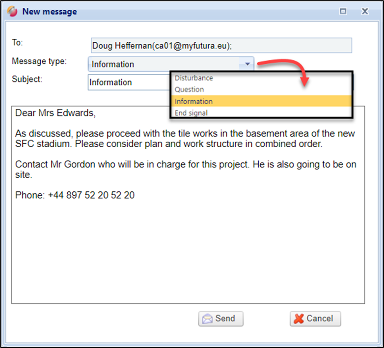 If message types (e.g. fault, completion, question, appointment) are maintained, you can select one from the drop-down window. These are defined in the Administration → Master Data management → Message Type area. This can only be done by your administrator.