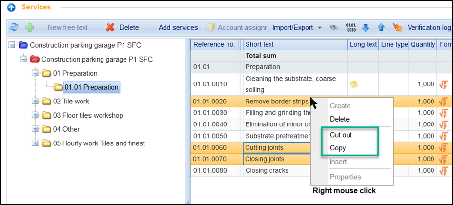 Select multiple service lines by holding down the CTRL key and selecting the corresponding service lines with the mouse and press right mouse button / "Cut" or right mouse button / "Copy".