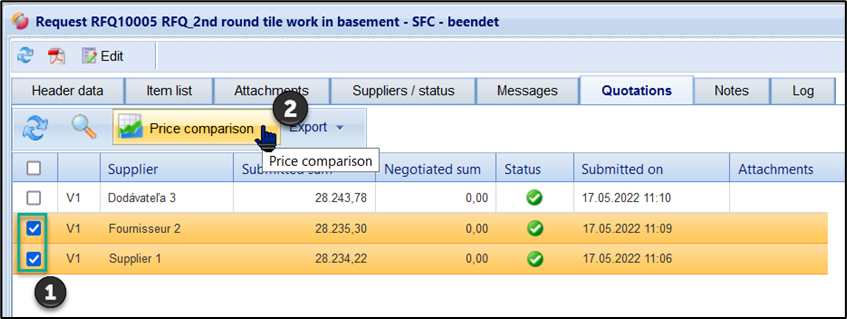 After the submission deadline and the opening of the quotation, you can open and evaluate the quotations in the price comparison list. Select the desired quotations in the quotation list and click on the button "Open price comparison list":