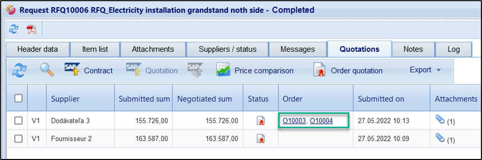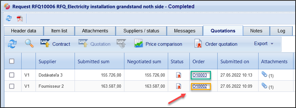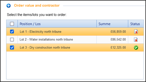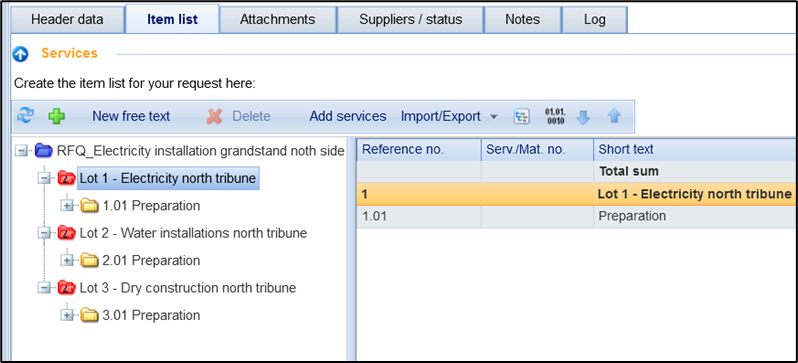 If you have used an items list with LOTs in the request, the order attribution can also be carried out per LOT after obtaining the quotations. The individual LOTs are to be understood in this transaction as individual items lists, and therefore, individual orders.