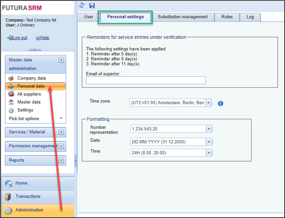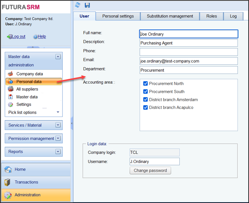 In the Personal Data menu, the user data of the user with whom you have logged in is displayed.
