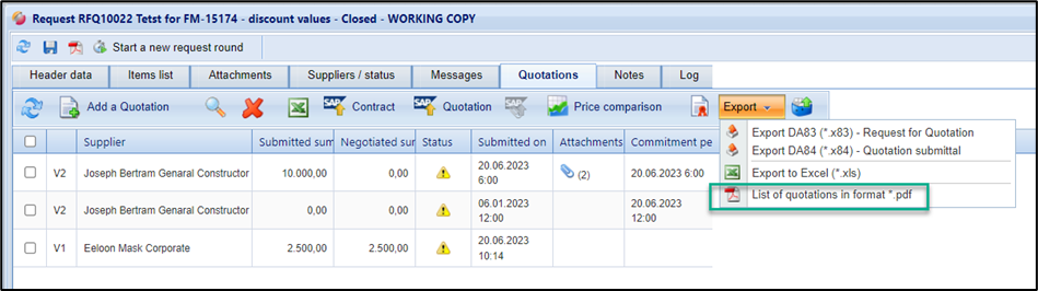For the evaluation of the quotations, you can export a quotation list of all submitted quotations as a PDF report. The quotation list contains a summary of the request information, an overview of requested suppliers, reasons for rejections and submitted quotations. You will also be provided with this option when placing an order.
