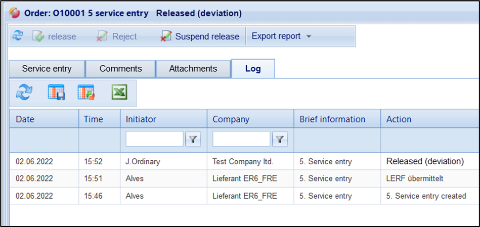 In the entry lists and on the tabs "Log" and "service entry", the release of the partial entry is logged, with the note that there were deviations.