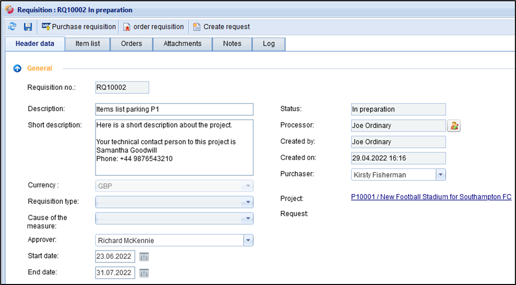 Header data | Display of the header data of a requisition. The data is again divided into different areas:
