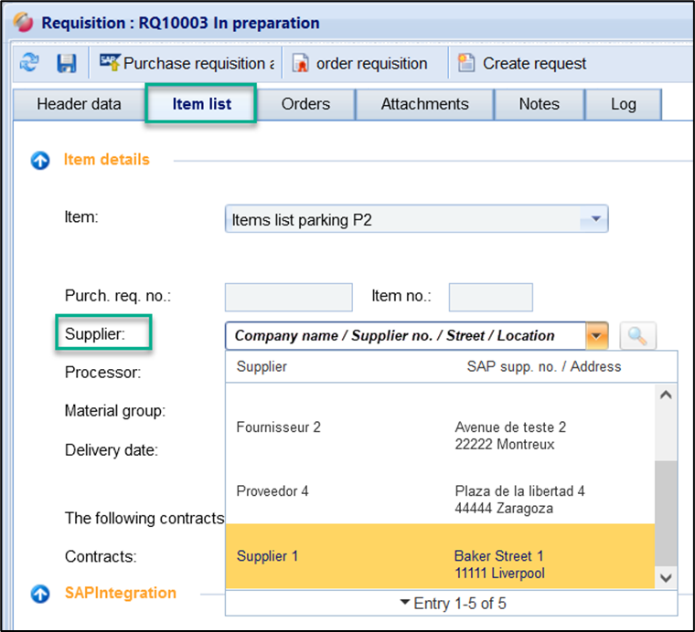 A supplier is assigned in the "Item details" area under the "Items list" tab.