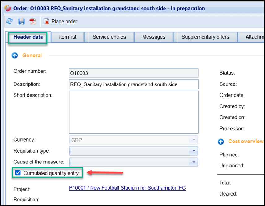 If the order has its origin in the FUTURA Engineering, the option "cumulative quantity entry" can be used. This option is already set in the FUTURA Engineering ordering system and has the consequence that the supplier must record his measurements cumulatively. This means that he must add newly provided services to the previously billed, already released quantities. In the "General" section under the "Header Data" tab, you can see whether the "Cumulative quantity entry" option is set.