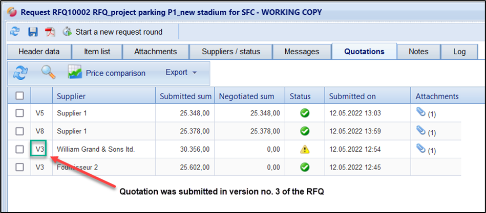 If a supplier has already submitted a quotation in a previous version, he can revise it and submit a new quotation. Quotations from previous versions will continue to be displayed on the "Quotations" tab. Thus, you can compare quotations across versions in the price comparison list!
