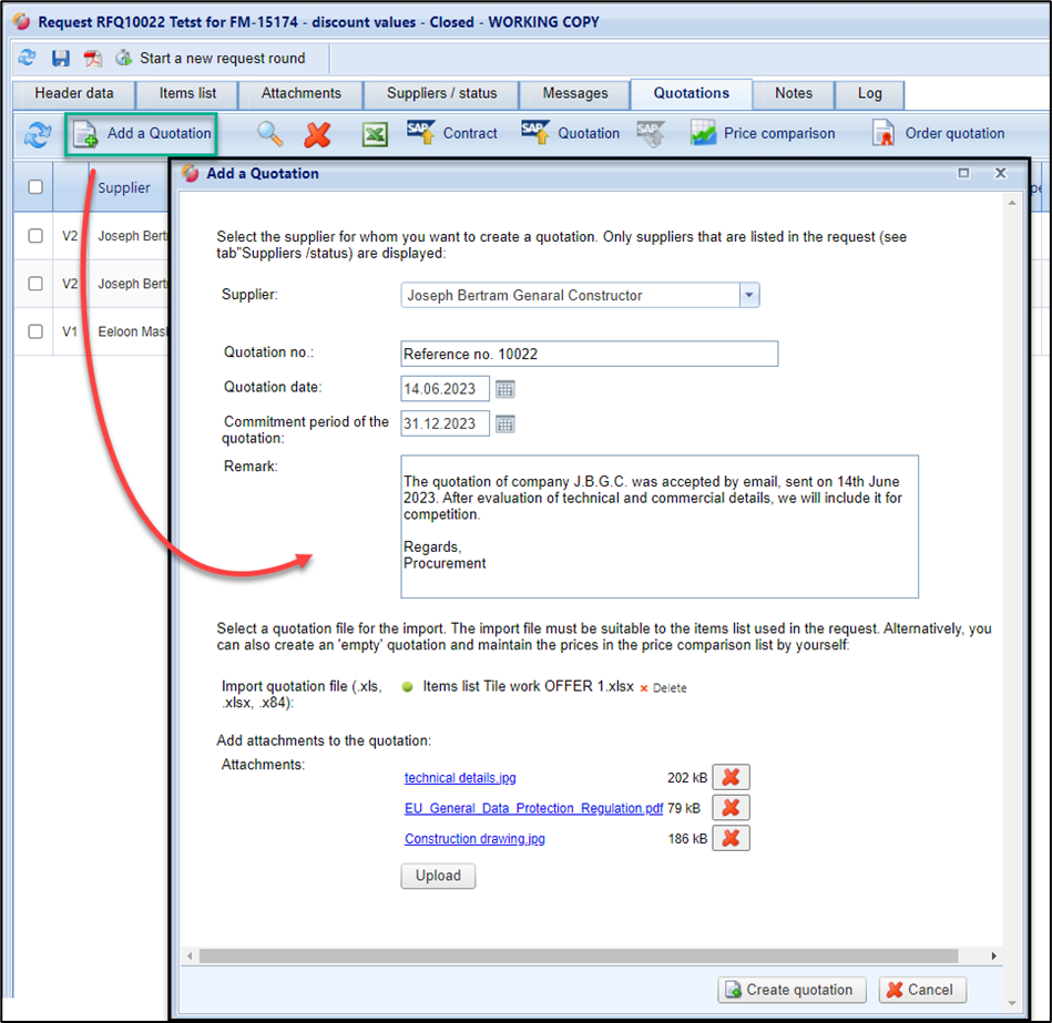 On the tab "Quotations" for each request type, you will find the "Add Quotation" button after the quotations were opened. A separate window will open in which you can fill in the information about the quotation received separately. Optionally, you can enter a remark. Here, for example, you can record how the quotation was received. This information remains as internal for your organization. You can import a suitable quotation file for the requested items list via Excel or GAEB file (X84). Additional documents can be uploaded as attachments in the lower area of the window.