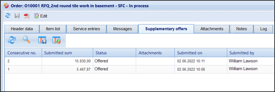 An overview of submitted supplementary quotations can be found in the register tab “Supplementary quotations”. Several supplementary quotations can be sent. As soon as a supplementary quotation for an order is available, you will be informed by e-mail.