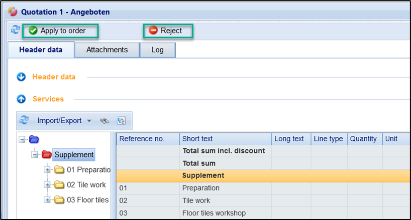 In the items list of processing an order, the supplier can independently and optionally submit a supplementary quotation. The preparation of the supplementary quotation is identical to that of a request, with the exception that the creation of the items list is carried out exclusively by the supplier. Using GAEB XML, an Excel import file or free text lines, the supplier can create his supplementary quotation including the quotation prices and send it to you as the purchaser within the same order. The supplier can also access Contract lines and use them to create the items list. The structure of the supplementary quotation and its quotation prices can be freely changed by you as the purchaser.