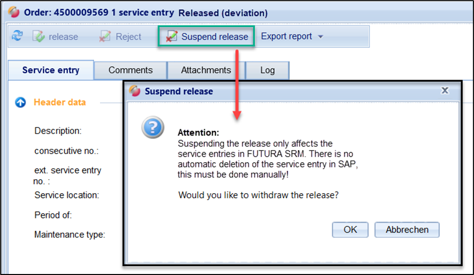 The release withdrawal of a service entry is possible if this function is set for your organizational unit and your assigned role(s) has the appropriate authorization. In the event of a release withdrawal of a service entry, it again receives the status "Under verification" and can be processed as usual by the assigned approver. Please note that the release withdrawal has no effect on the sheet (service entry sheet / service entry sheet) in SAP. The cancellation in SAP must first be checked and carried out manually. The renewed release of the service entry creates a new sheet in SAP.