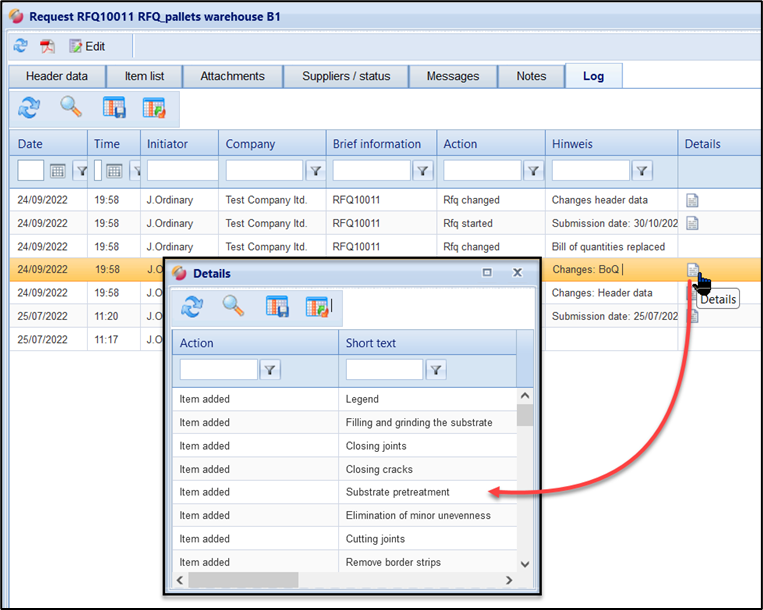 More details about a modification of an items list can be viewed in the "Log" tab with the button .