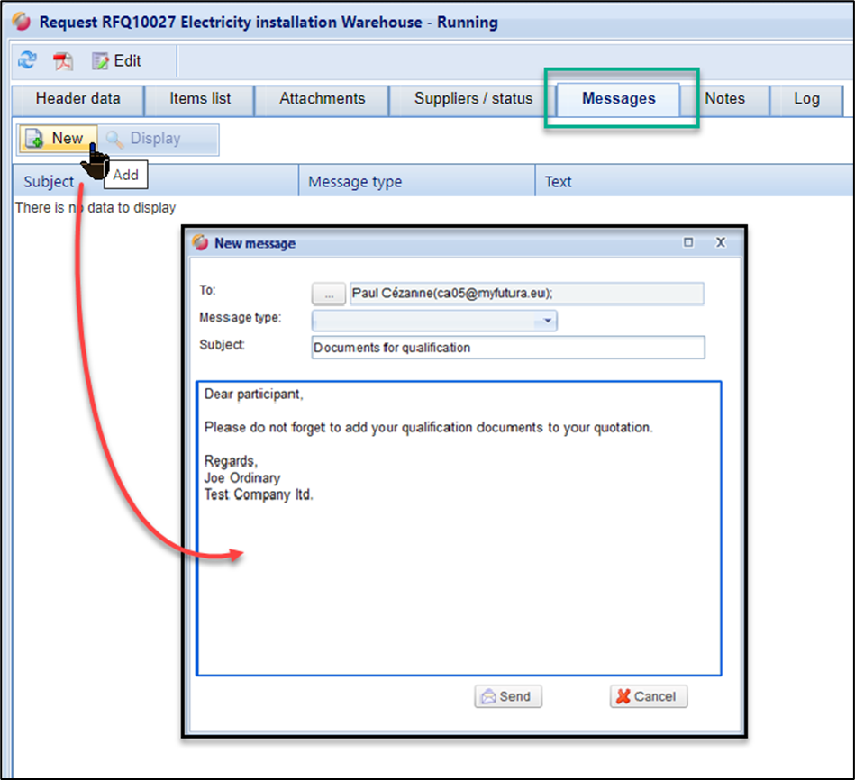 As soon as the request has been started (status = running), you can send messages to the supplier group of the request participants. To create a new message, click on the "New" button. The following window opens:
