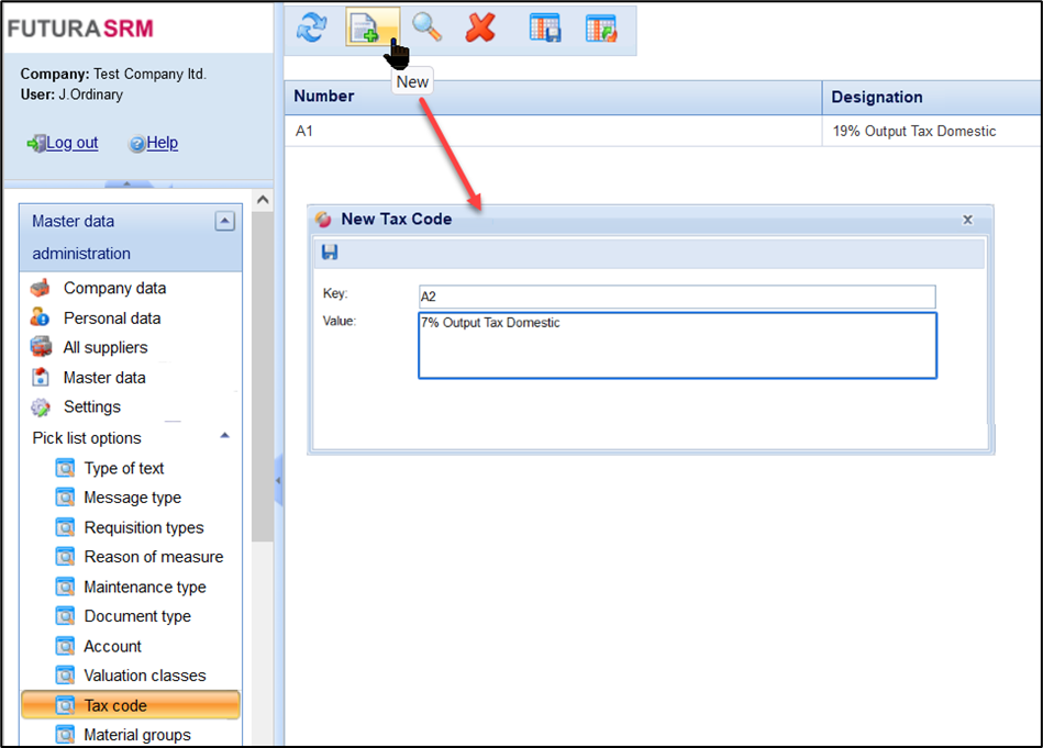 In this area, define which tax codes are to be available when you trigger orders from FUTURA Engineering. In order for the order to be created correctly in SAP, this data must be identical.