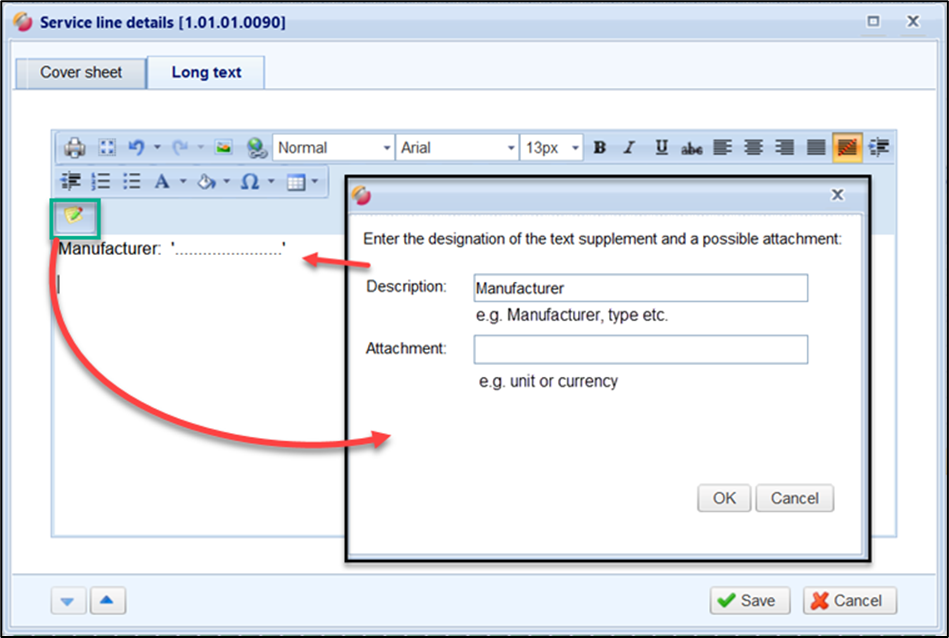 Any number of text additions can be inserted in a long text. To do this, double-click to open the details of the service line, call up the Long Text tab, select the place in the text where the placeholder for the text supplement is to be placed and click on the "Text-by-suppler" button: