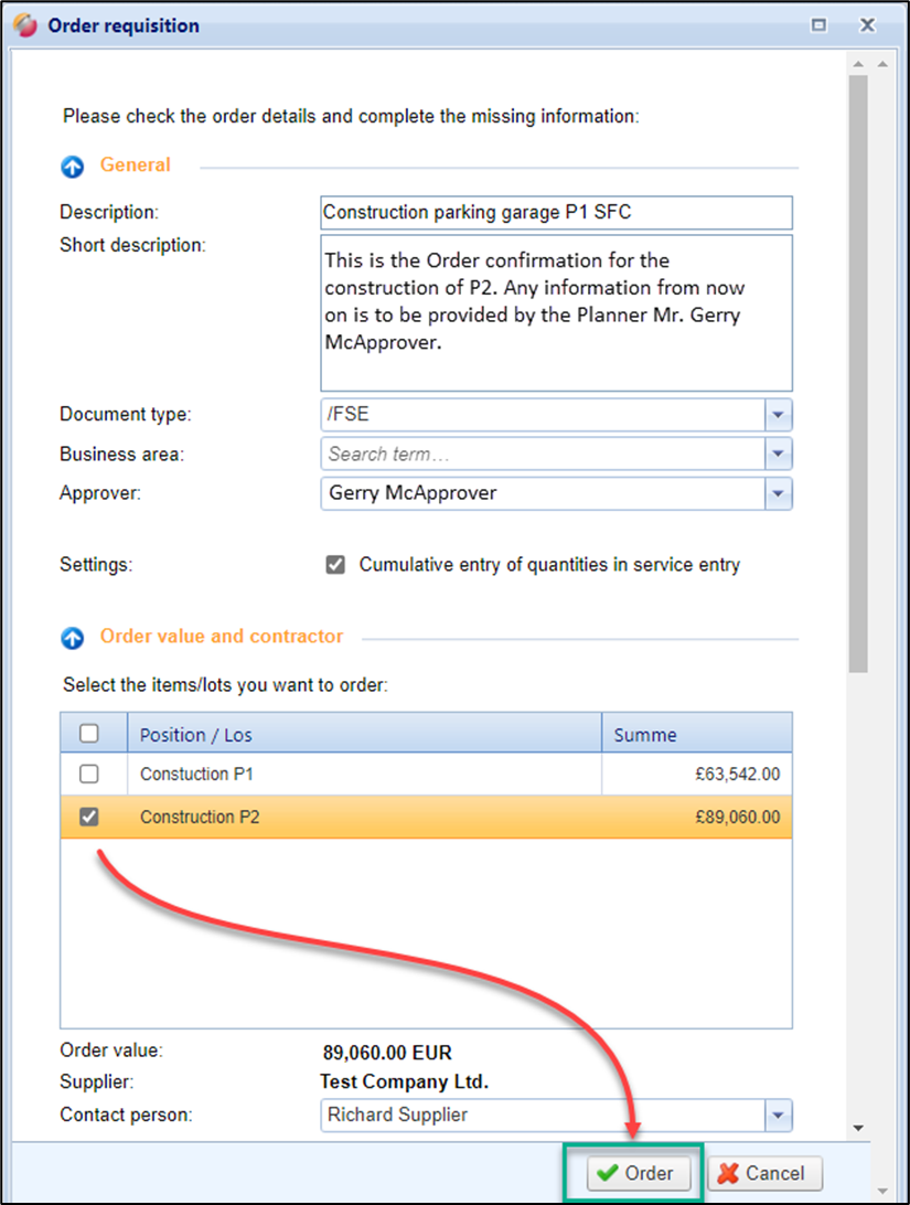 If all mandatory criteria for a LOT (= order item) are maintained, the order can be triggered with the button “order requisition”. This opens the dialog box for the final selection fields, e.g., the selection of the approver. With the button “order” the order is triggered: