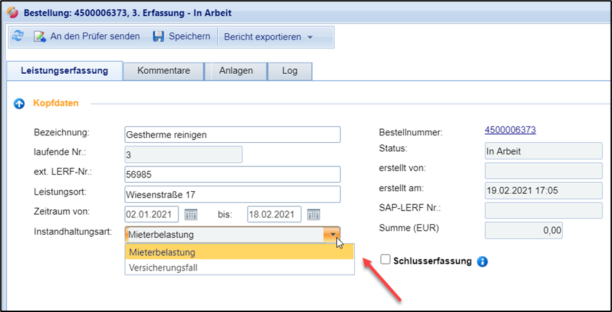 The type of maintenance (e.g., insured event, tenant load, maintenance, etc.) is a criterion that you can use for a more detailed description of the recorded service.