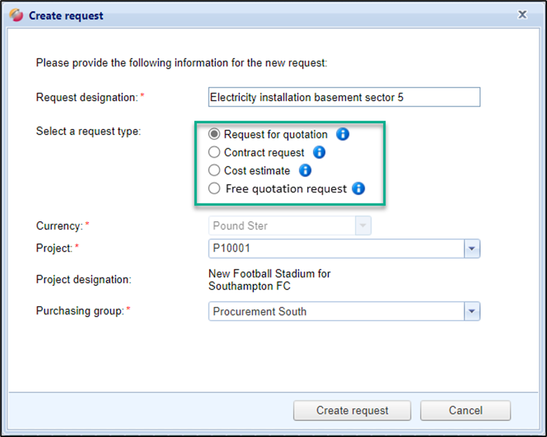 The Contract request is addressed to one specific supplier (= supplier with purchase agreement), services should primarily be Contract services, the prices negotiated in the Contract are transferred to the request and displayed to the supplier as default prices. The supplier has the possibility to give a reference no. percentage discount or surcharge on the header level in his quotation.