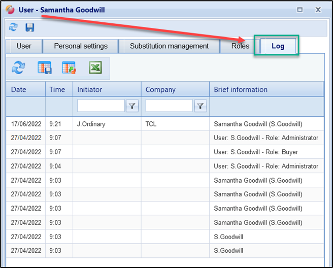 In the Administration / Rights management / User Log area, changes to users and their role assignment are logged. These are: